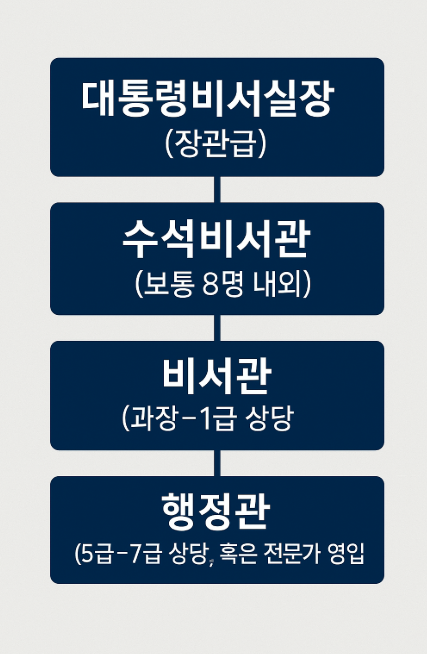 | 실장/수석비서관 | 분야별 책임자 (장관급 또는 차관급) | 정무수석, 홍보수석 등 |