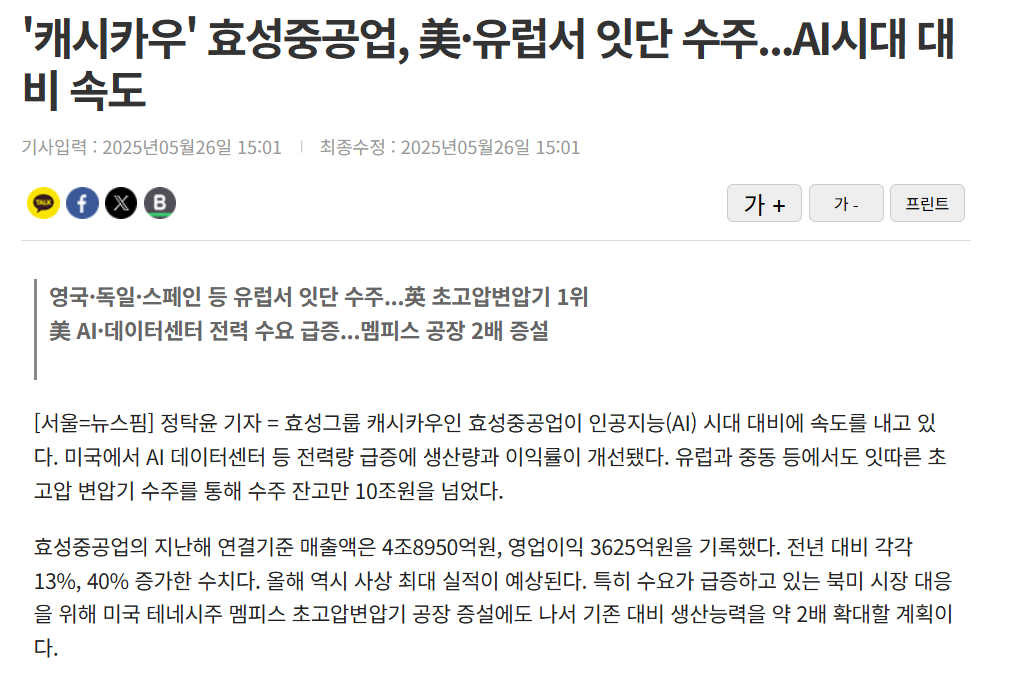 - 효성중공업: 유럽 전력시장 성장에 따른 초고압 전력기기 수요 증가와 글로벌 전력 인프라 시장 진출 확대.