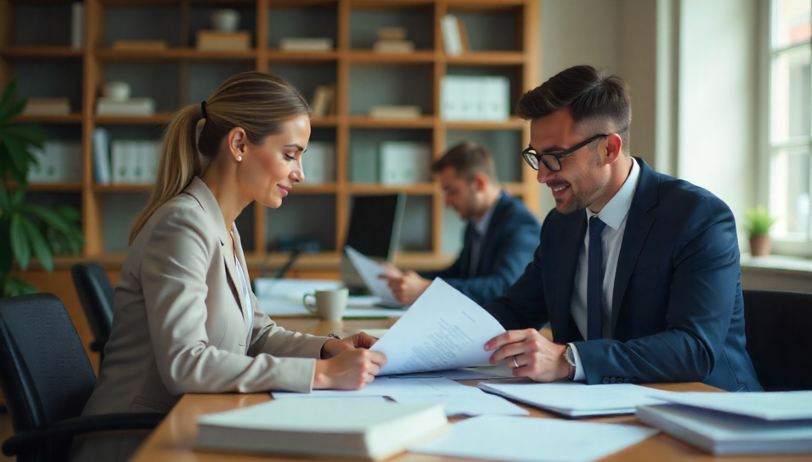 이미지 프롬프트: "두 개의 사무실 장면, 하나는 변호사와 법정 관련 자료, 다른 하나는 부동산 등기 서류와 도면이 있는 사무실"