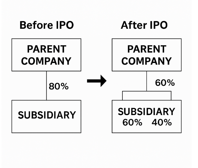 - 자회사가 상장되면 일반 투자자에게 신주가 배정되므로, 모회사의 자회사 지분율이 낮아집니다.