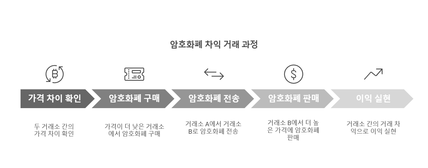 차익 거래는 가격 차이를 이용해 저렴한 거래소에서 사고, 비싼 거래소에서 파는 방식으로 이익을 얻는 전략입니다. 이 과정은 몇 가지 단계를 거칩니다: