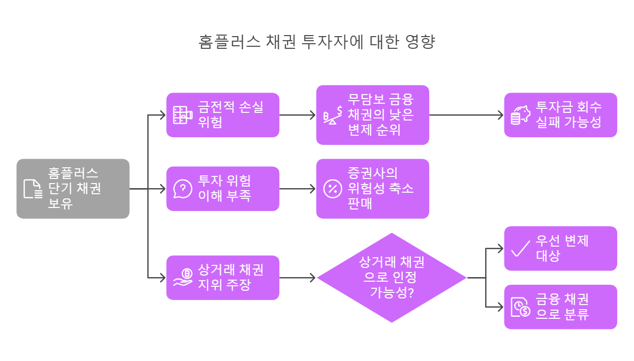 - 잠재적 금전적 손실: 홈플러스의 단기 채권을 보유한 개인 투자자와 일반 법인들은 상당한 금전적 손실을 입을 위험에 처해 있습니다 . 기업 회생 절차에서 무담보 금융 채권은 담보 채권이나 공익 채권(미지급 임금, 협력사 대금 등)보다 변제 순위가 낮아 , 투자자들은 투자금의 일부 또는 전부를 회수하지 못할 가능성이 있습니다 . 특히 홈플러스 단기 채권에 투자한 중소기업들의 경우, 투자 손실이 기업의 재정 안정성에 부정적인 영향을 미칠 수 있습니다 .