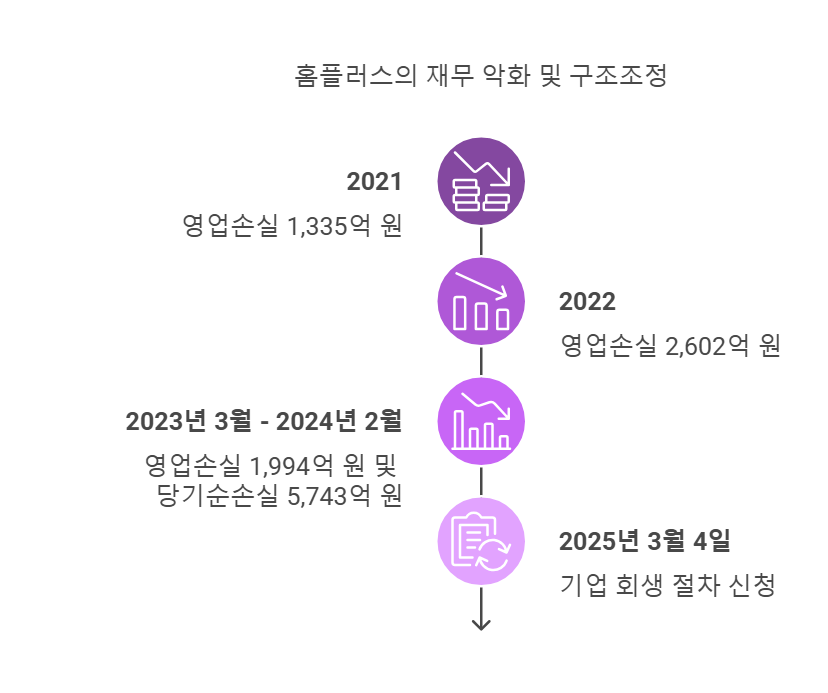 - 악화된 재무 성과: 홈플러스는 기업 회생 절차 신청 직전 심각한 재무 악화를 겪고 있었습니다. 2023년 3월부터 2024년 2월까지 약 1994억원의 영업손실과 5743억원의 당기순손실을 기록했으며 , 총 차입금은 5조 4620억원, 부채비율은 1408%에 달했습니다 . 이는 2022년 영업손실 2602억원 과 2021년 영업손실 1335억원 에 이어 지속적인 적자를 기록한 결과입니다 . 당기순손실 또한 꾸준히 증가하여 최근 보고 기간에는 5743억원에 이르렀습니다 . 재무 분석 지표인 Z-Score 역시 0.509로 부도 위험이 높은 상황임을 시사합니다 .